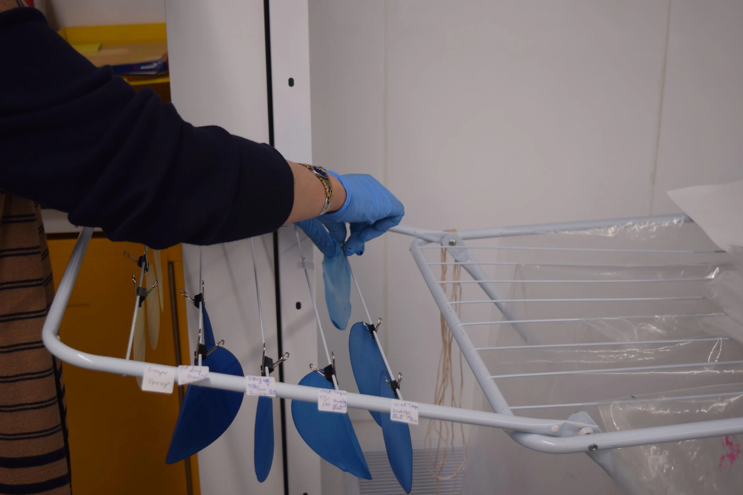 Before dyeing paper, the indigo vat is prepared in advance by taking an indigo container (ḵom-e nīl garī) and placing indigo solution inside, then sealing it. It should not be touched for one day. Paper sheets are dipped into the water and drained on a board until the papers become slightly hard. Do not let the moist papers dry completely because stains may appear on the paper if it is dyed in a dry condition. In case the indigo vat is far from the workplace, it may dry during the dyeing process. In this case, apply a damp cloth on top of the sheets of paper to prevent the paper from drying. To dye paper, insert it vertically into the indigo vat lengthwise and not widthwise (not laid out flat). Take the paper out of the dye and dip it in clear water to wash. Finally, let it dry.