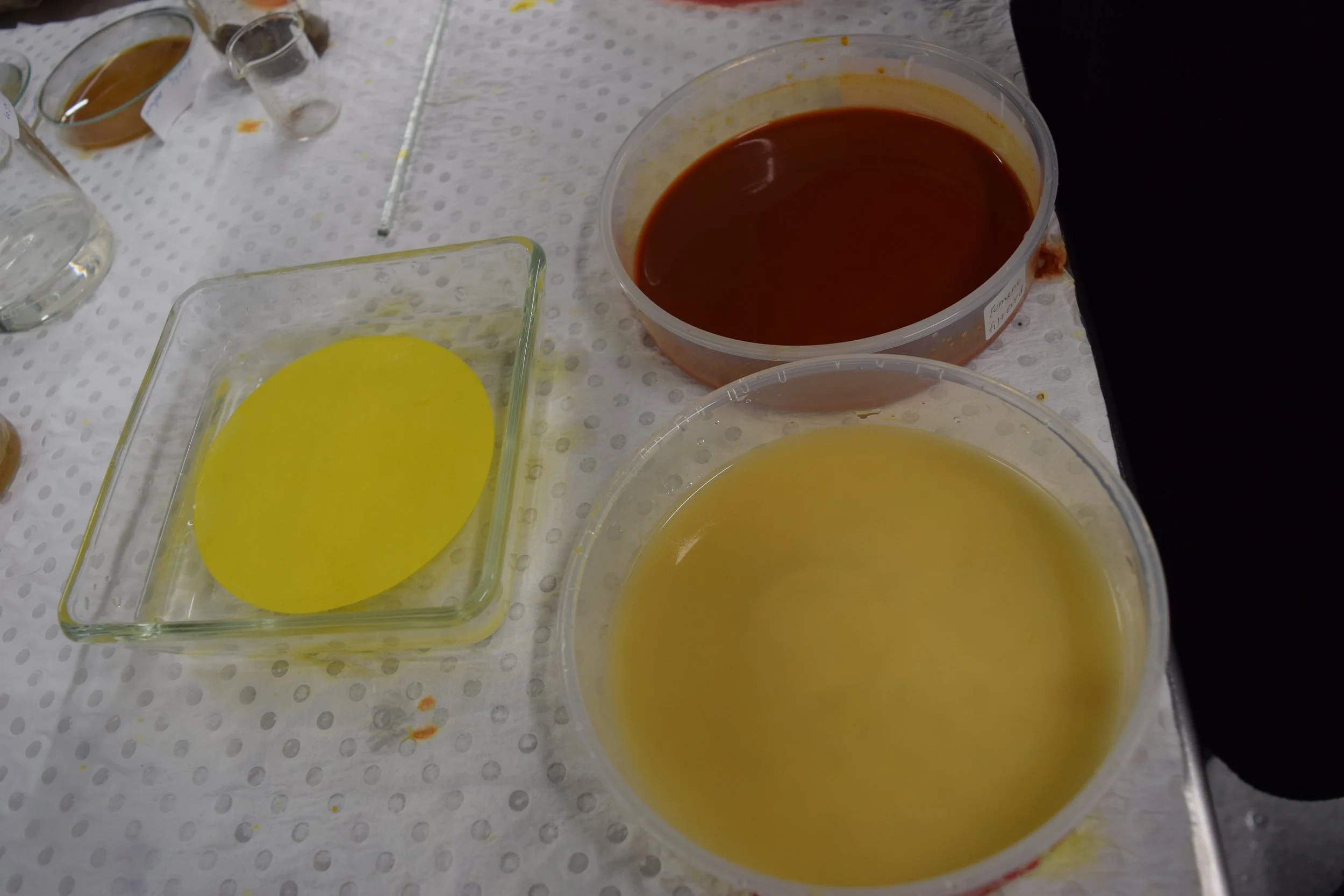 Take 20g of turmeric roots or turmeric powder and grind them using a pestle and mortar. Transfer the ground turmeric to a glass jar and add 200 ml of water, bringing it to a boil. Stir the mixture and filter it to extract the turmeric dye. Grind 1g of alkaline ash, dilute it with lukewarm water, and filter the alkaline solution. Add the alkaline solution to the filtered turmeric dye, stir the mixture, and pour it into a tray. Prepare two other trays, one with filtered water and the other with filtered lemon juice. Dip the paper into the turmeric and ash dye bath. For a deep yellow, repeat the process as needed. For a lighter shade, add more water. Afterward, dip the paper in lemon juice, agitate well, then dip it in water and wash thoroughly. Finally, take it out and let it dry in the shade.